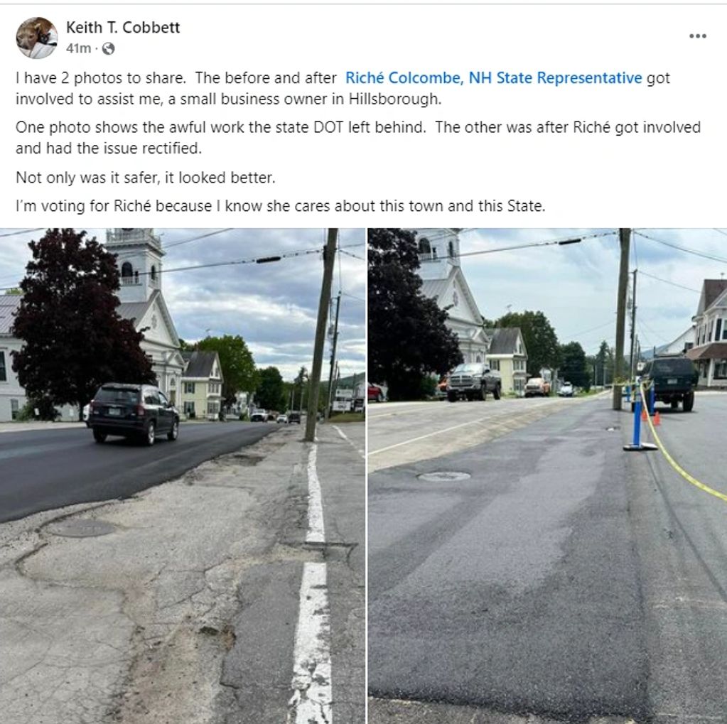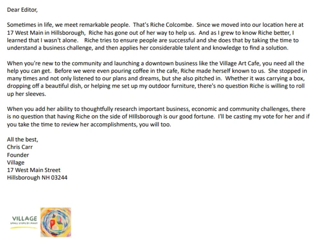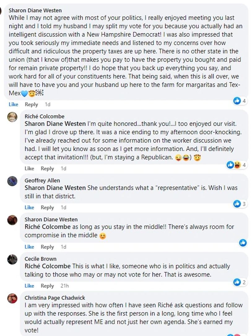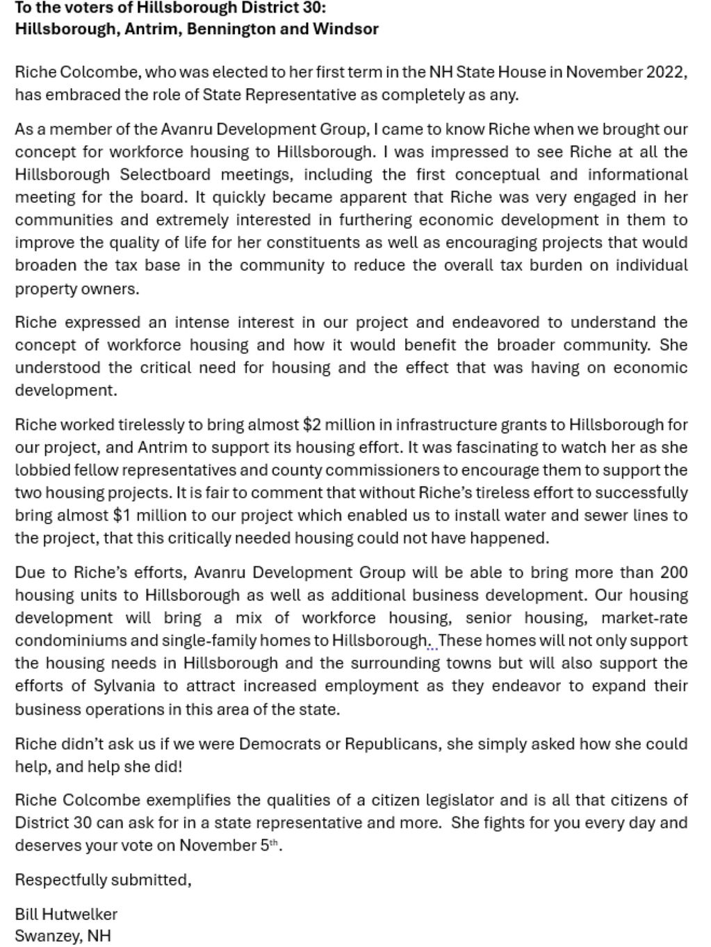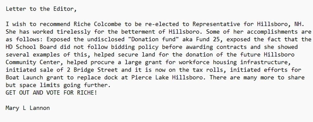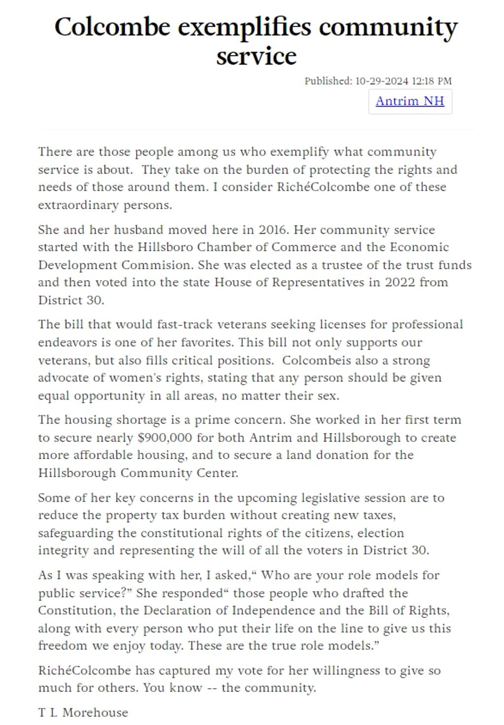 Hillsborough's State Representative District 30 has a great opportunity to add Riché Colcombe in the November election. She ran a solid (almost over the finish line) campaign in 2020 and is not deterred from running again when common sense representatives are needed to stand firm for working people, school choice, and control of taxes and spending. Riché is and has always been available to people as she is involved with the Hillsborough Chamber of Commerce, the Economic Development Commission, Fuller Library, is a Trustee of the Trust Funds in Hillsborough, and is a notary. An experienced businessperson who gives back to the community and stays involved, Riché takes the time to attend many public meetings (something more of us should do) and does her homework. She brings to public meetings solid questions that need to be asked. Riché makes sure town and school business is transparent and open. Riché is good at finding discrepancies in spending that truly needs an explanation. If the explanation makes sense, Riché will support it. If no one can explain the cost and answer her questions, she has done for us what more of us need to do, she continues to attend local meetings, provides input, and ask questions. Riché wants to ensure elected and appointed people spend wisely. She will do the same hard (thankless) work at the state level! That is the kind of person I want to represent me. She has been gifting her time over these years to make sure a strong government prevails. Vote for Riché Colcombe for State Representative to Hillsborough's 30th District. Good government works and Riché will push for positive programs. You will be glad you voted Riché Colcombe into office.