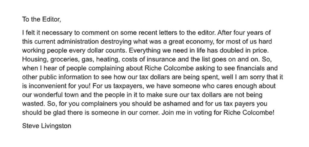 I just wanted to take a moment to stress the importance of voting. If you think it's not going to make a difference or you don’t have time then, I hope you enjoy paying double for electricity, heating oil, groceries, gas and diesel, and just about anything else you buy! It’s time we get our towns, state and country headed back down the right road. If you’re a business owner, make sure all your employees are given the time to go vote! Clearly, the people that are in there now don’t know their ass from their elbow. At some point in time, money must have started to grow on trees. We can vote out these wasteful spenders before we are all broke. The problem is most of the time we don’t know the people we are voting for. Well, I know one, Riche Colcombe. She has been a friend of mine for years and the treasurer of the Hillsboro Night Rider’s Snowmobile Club we all love. She is a watchdog for wasteful spending. This mess we are in won’t be fixed overnight but Riche is a step in the right direction. There are people that don’t like Riche but they are the people that got us in this mess. So vote for Riche for State Representative on November 8th, and if you get a chance reach out to her and share your concerns.